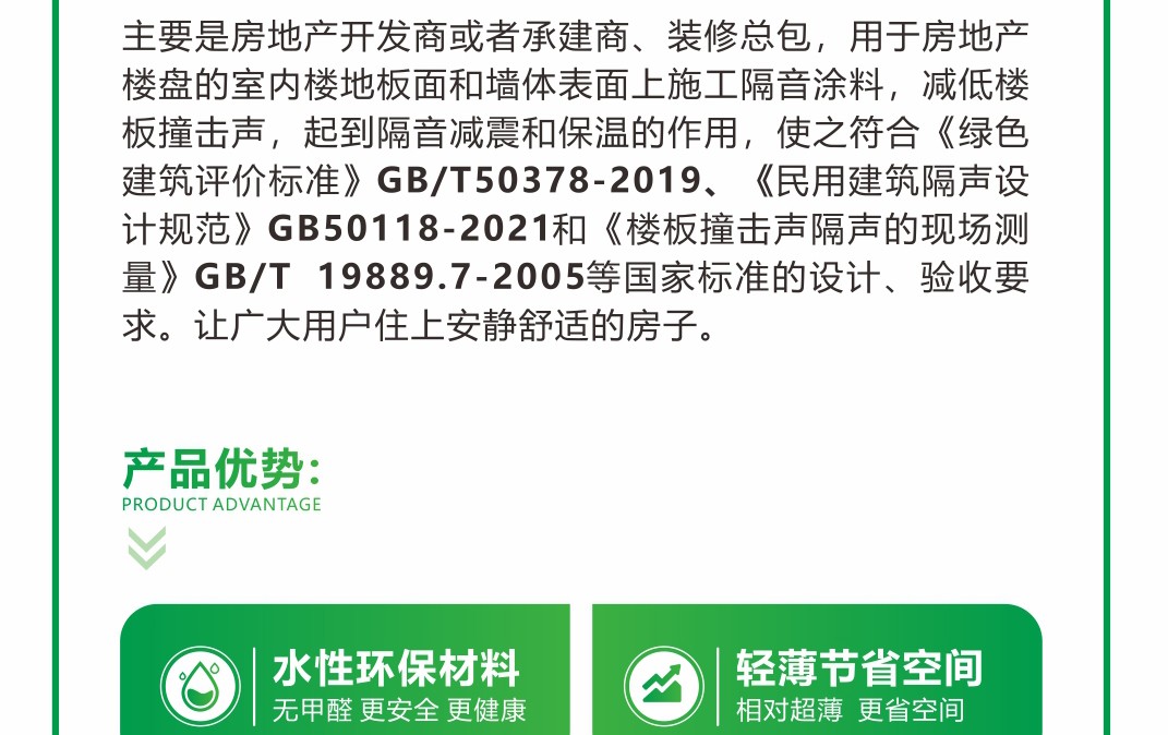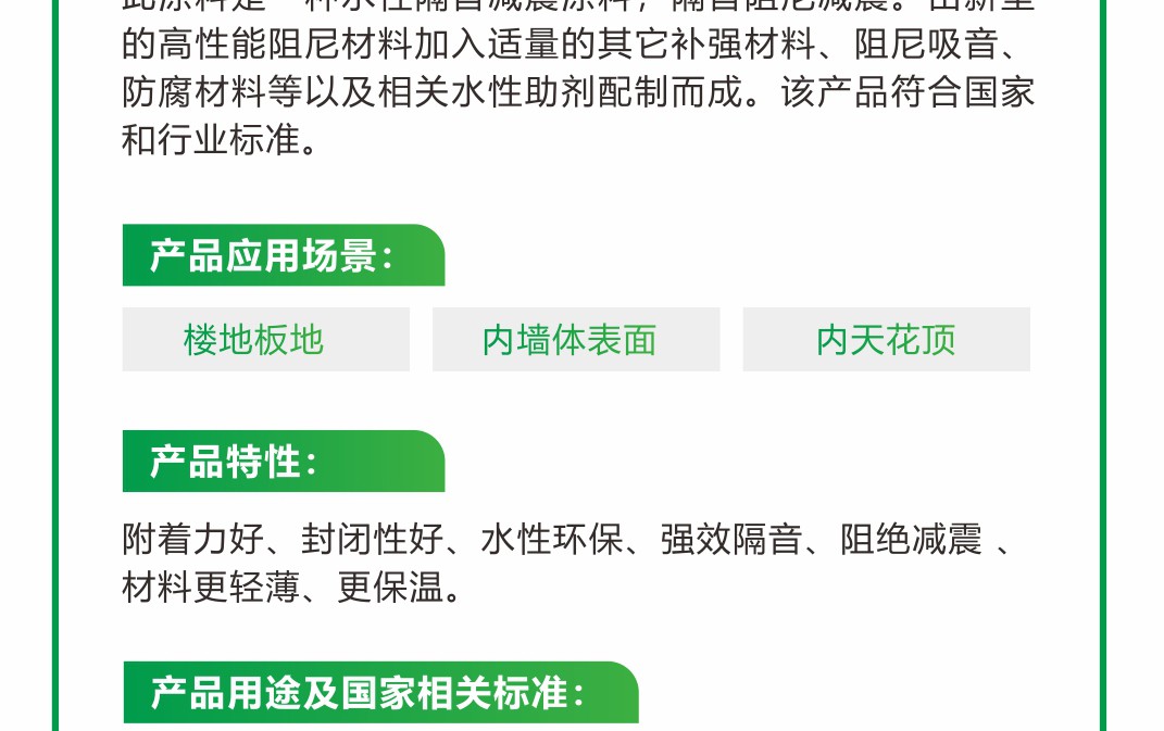 由新型的高性能阻尼材料加入適量的其它補(bǔ)強(qiáng)材料、阻尼吸音、防腐材料等以及相關(guān)水性助劑配制而成。該產(chǎn)品符合國(guó)家和行業(yè)標(biāo)準(zhǔn)。附著力好、封閉性好、水性環(huán)保、強(qiáng)效隔音、阻絕減震 、材料更輕薄、更保溫。適用于樓地板底、內(nèi)墻體表面,內(nèi)天花板頂。