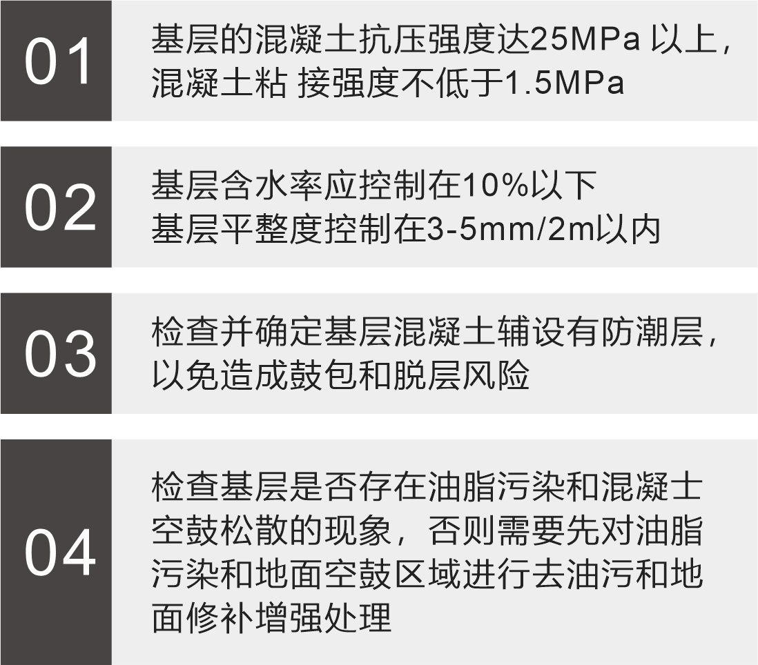 對于新混凝土基層要求水泥標號達C25以上,砼養(yǎng)護15天以上。在-10℃至65℃溫度范圍內保持其物理性能。