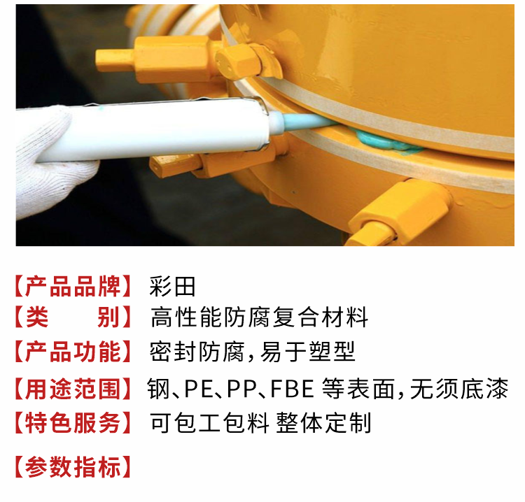 彩田粘彈體防腐膏主要用于一些難于防腐的異形設備諸如法蘭、閥門、各種管配件、吊環、人孔等所設計開發的一種腐蝕防腐新產品。簡單介紹下粘彈體防腐膏的操作說明: