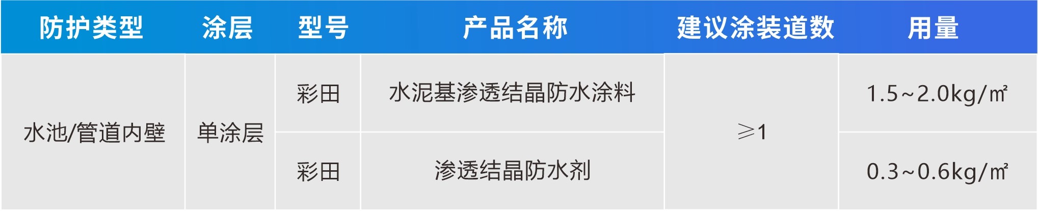 本方案采用滲透結晶單涂層體系,即安全無毒、高滲透性和強封閉性的滲透結晶型涂料對池壁進行防水防護。涂刷后的涂料滲透到混凝土的孔隙中發生原位固化交聯,能有效封閉混凝土的微觀孔隙并對基面微裂縫具有自修復能力。阻擋水及其他介質進入混凝土,防止有害物質析出到飲水中。實現對混凝土的結構增強及對飲用水水質保護的雙重功能。