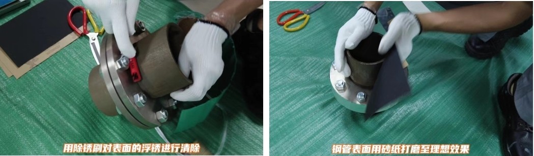 3、用布條擦拭干凈法蘭壁面(犧牲陽極與法蘭面直接接觸的面必須干凈,才能保證不影響它的導(dǎo)電作用),(光固化材料在施工安裝過程中要避開日光和紫外線使用,建議在避光條件下施工。)