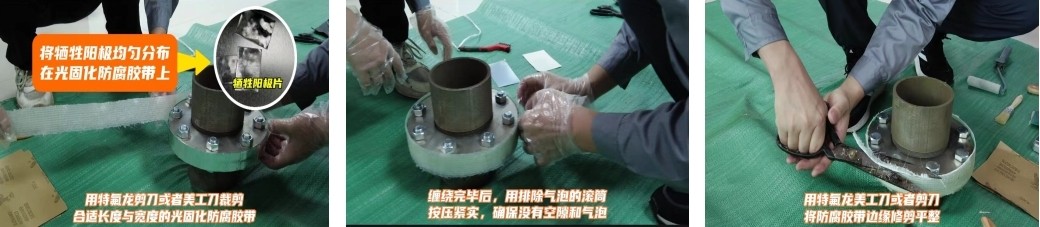 2、沿著法蘭側(cè)面纏繞,一邊纏繞一邊拉緊并按壓光固化防腐膠帶,保證沒有空隙和氣泡等,纏繞完以后再用按壓的滾筒,側(cè)面按壓一下,保證它的密實(shí)性;(光固化材料在施工安裝過程中要避開日光和紫外線使用,建議在避光條件下施工。)