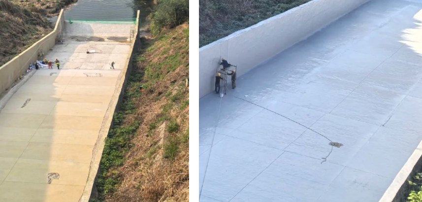 對基面打磨清理后使用彩田新型快速修復抗沖磨材料進行修復找平(施工厚度3mm),后涂刷1mm氟改性高聚物降糙防護涂料進行表面防護處理。