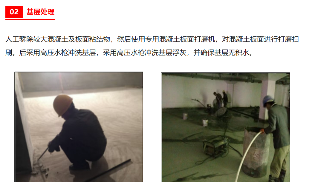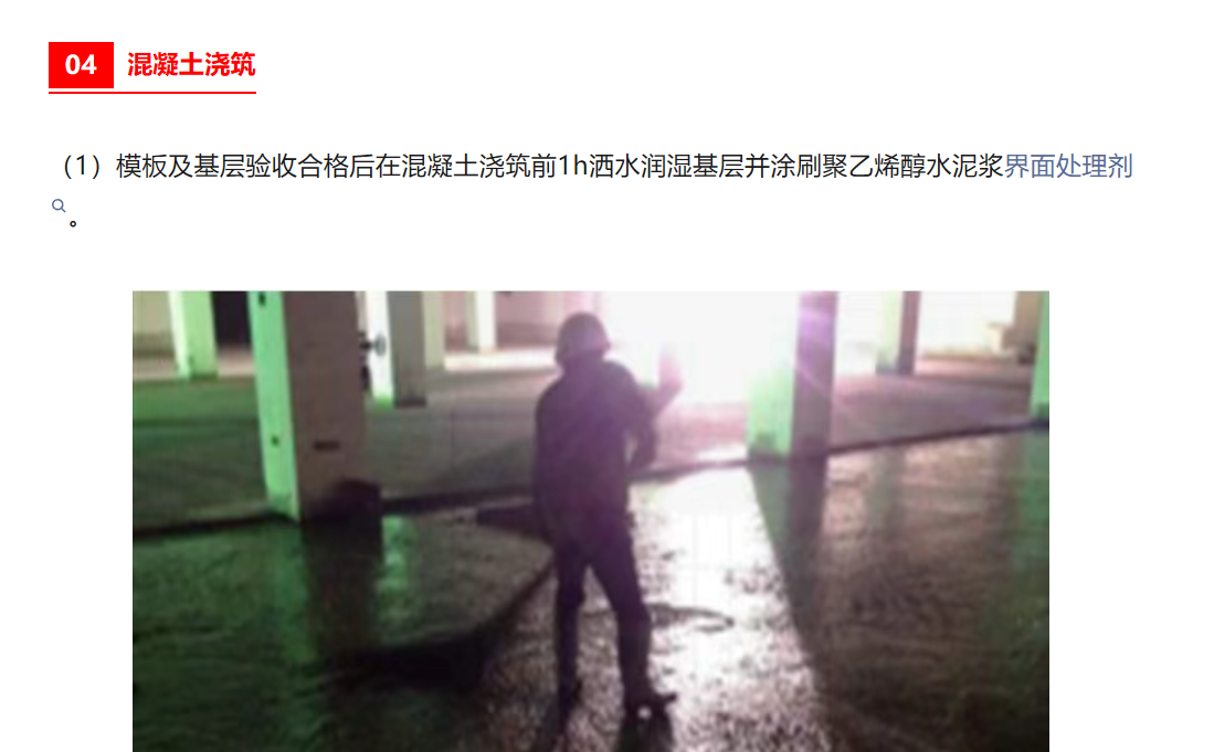 • 混凝土澆筑前潤濕基層后涂刷新型聚乙烯醇界面粘合劑,增加混凝土面層和基層板面的粘結度。