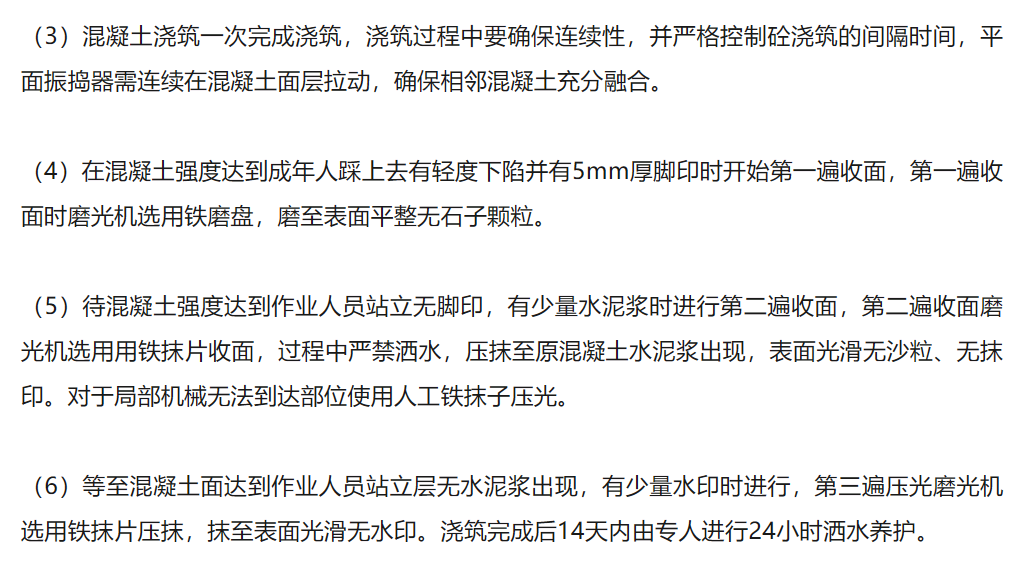 3、混凝土澆筑中使用“遠距離跳倉法”施工(第二天澆筑場地距第一天澆筑保持距離,確保澆筑中機械、車輛不擾動上次澆筑的混凝土)三遍壓光施工。“遠距離跳倉法”避免因澆筑中車輛震動造成前期澆筑混凝土與基層板面分離造成空鼓,三遍壓光確保了混凝土密實度,及混凝土干縮造成裂縫。