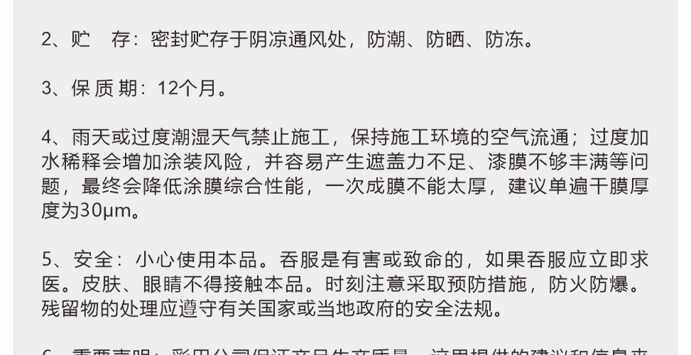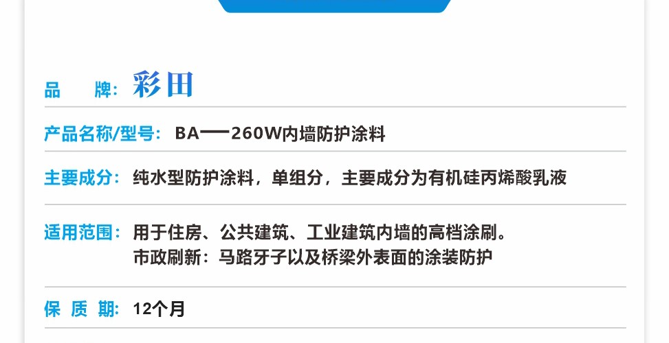 適用各種建筑的內(nèi)墻涂裝,純水型防護涂料,單組分,主要成分為高檔丙烯酸乳液。具有優(yōu)異的耐候性、耐水性、耐擦洗性。不含有機溶劑,無毒無污染,不燃不爆,以水為分散介質(zhì),可以用水稀釋和清洗涂裝用具,屬于環(huán)境友好涂料。