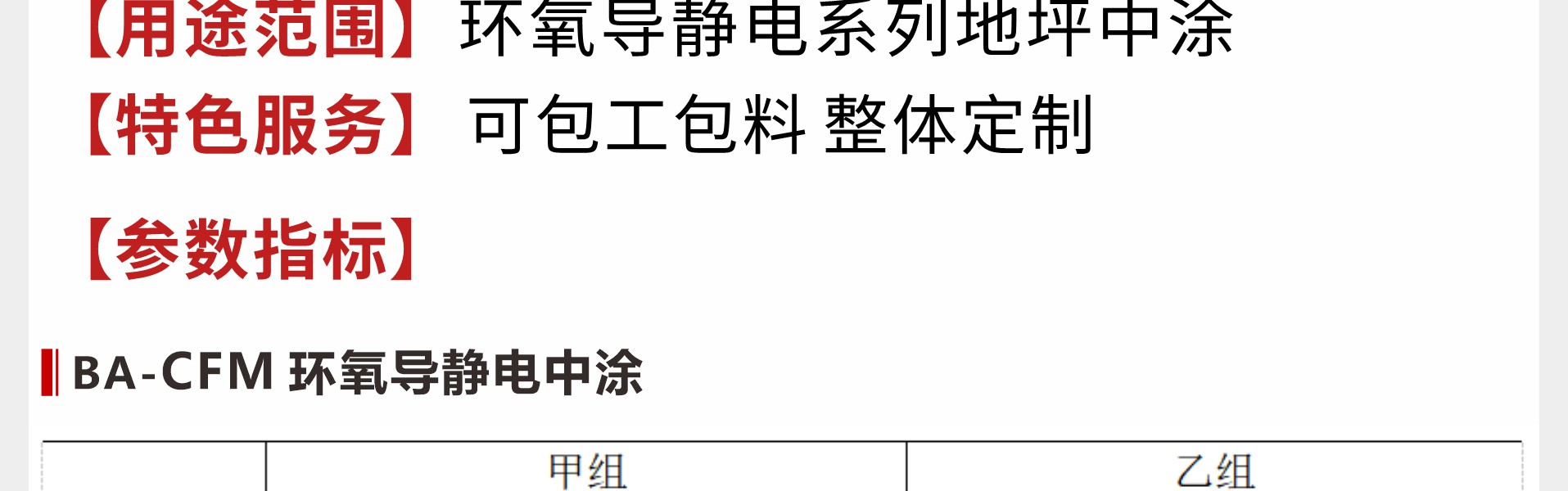 概述:彩田BA-CFM高固含環氧防靜電中涂是一種常溫固化雙組份無溶劑型環氧樹脂漆。特性:1、無溶劑、環保型;2、良好的導電性。用途:1、調配石英粉成環氧膩子,提高地板涂料的強度、平整度和導電性;2、防靜電地坪工程中用來封閉銅箔。物理參數:施工說明:混合:按比例將甲、乙組份倒入攪拌桶后攪拌均勻。視粘度可添加3-5%左右的稀釋劑,攪拌均勻后倒在涂有底油的基面上。施工方法:本品容器中固化較快,一次配漆量以一個施工...