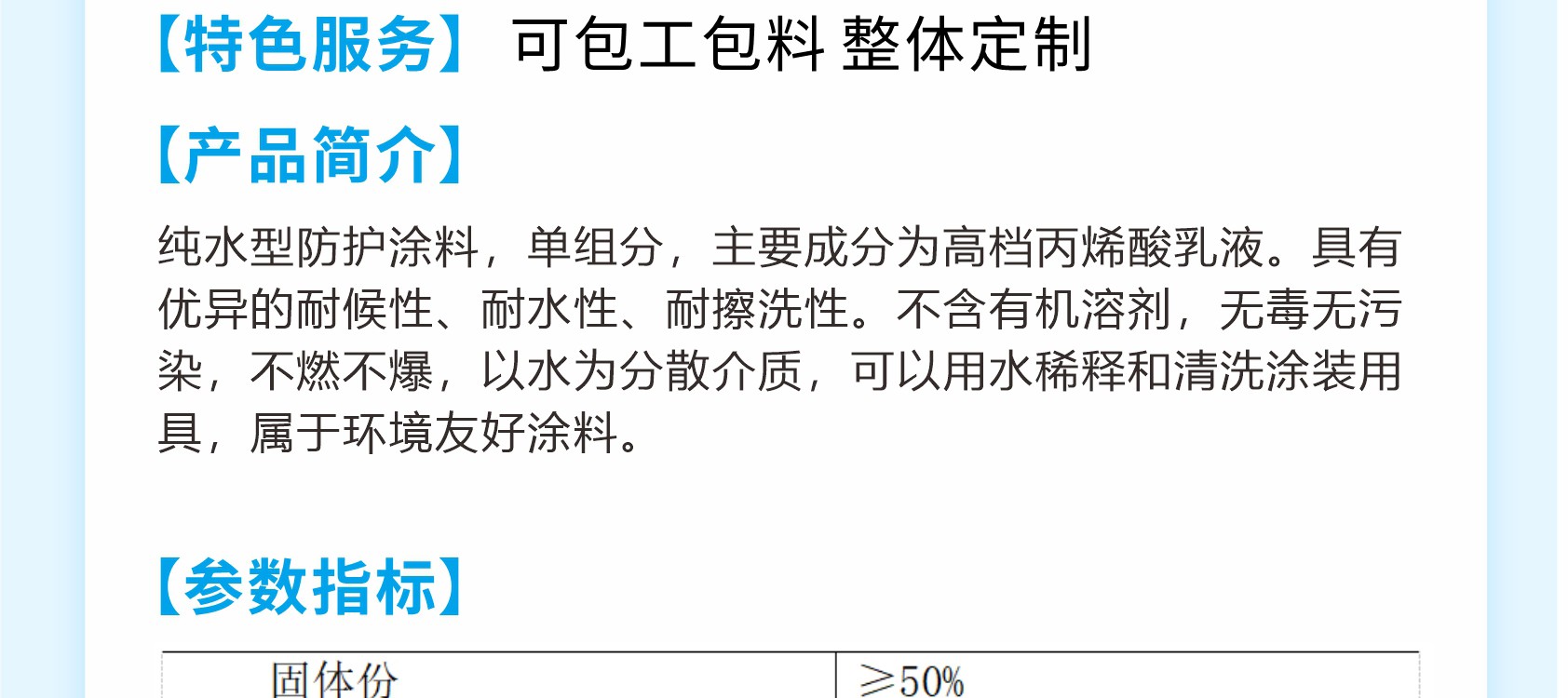 純水性防護涂料,單組分,主要成分為高檔丙烯酸乳液。具有優異的耐候性、耐水性、耐擦洗性。不含有機溶劑,無毒無污染,不燃不爆,以水為分散介質,可以用水稀釋和清洗涂裝用具,屬于環境友好涂料。